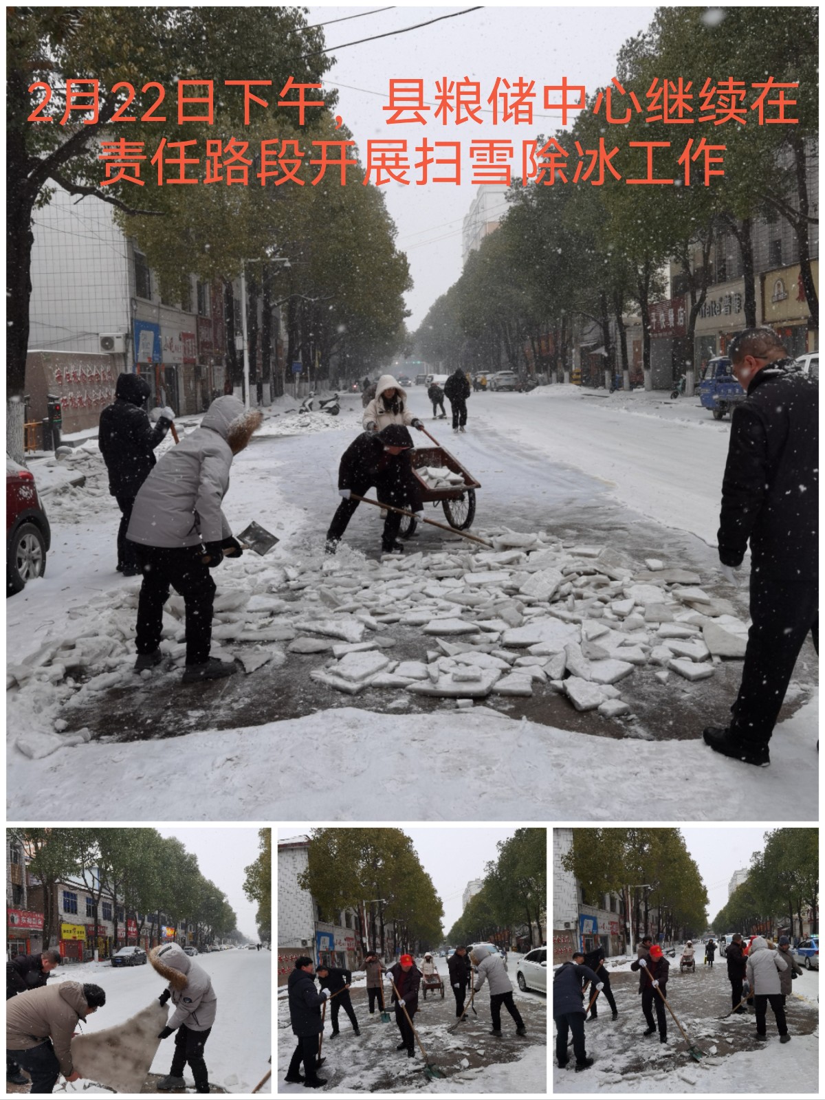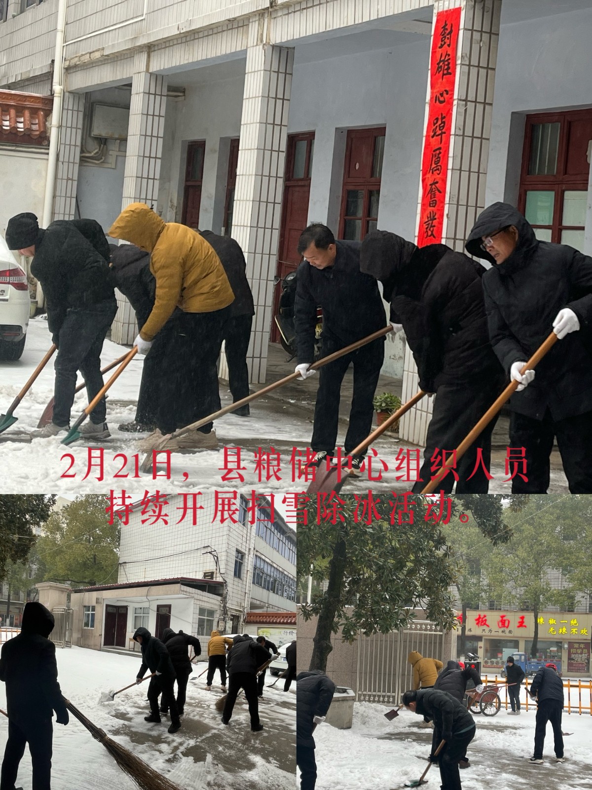 2月23日,连续三天的强雨雪冰冻灾害天气,县城银装素裹,居民出行不便,为最大限度减少积雪结冰对道路安全造成的不利影响,县粮储中心第一时间积极组织全体干部职工开展扫雪除冰保出行活动。